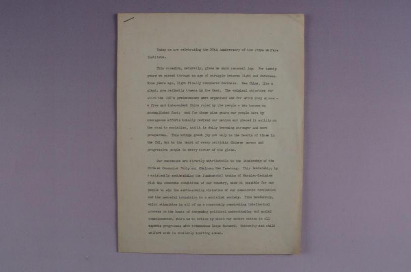 1958年6月14日宋慶齡在慶祝中福會二十周年大會上的講話稿