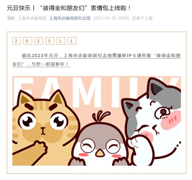 另一方面,不斷豐富宣傳載體,開展形式多樣的宣傳活動。一是策劃推出傳統(tǒng)手工社教活動。元旦前夕,宋慶齡故居紀念館結合宋慶齡生前慶祝佳節(jié)及對中國傳統(tǒng)文化喜愛的歷史,策劃推出“繪團扇·賀元旦”主題活動,通過活潑有趣的形式拉近與偉人的距離,增進對傳統(tǒng)文化的熱愛?;顒犹貏e邀請了專業(yè)繪畫老師拍攝團扇繪畫教程視頻,并為參加人員提供了團扇、顏料、展示架、調色盤等活動物料。本次活動面向共建單位及社會人士開展,一經(jīng)推出就受到大家的歡迎,名額很快報滿,截至目前,已有不少參與者的作品創(chuàng)作完成,預計于1月中下旬在本館新媒體平臺進行成果展示,喜迎新年,并為迎接宋慶齡誕辰130周年紀念日預熱。二是依托館藏資源設計開發(fā)文創(chuàng)表情包。繼2022年推出“見字如晤”系列表情包之后,宋慶齡故居紀念館在2023年新年伊始上線推出了最新IP卡通形象“彼得金和朋友們”微信表情包。本次IP卡通形象設計靈感來源于宋慶齡曾經(jīng)在上海寓所養(yǎng)過的貓咪“彼得金”“來賓”和鴿子“戈西”,通過對動物卡通造型的簡筆畫處理,搭配故居主樓、花園等特定場景,以及運用體現(xiàn)上海地方文化特色的滬語方言文字表達,適合不同年齡段人群使用。表情包上線首日下載量達135次、使用量達559次。據(jù)后臺統(tǒng)計,表情包的使用人群集中在19-48歲年齡段。